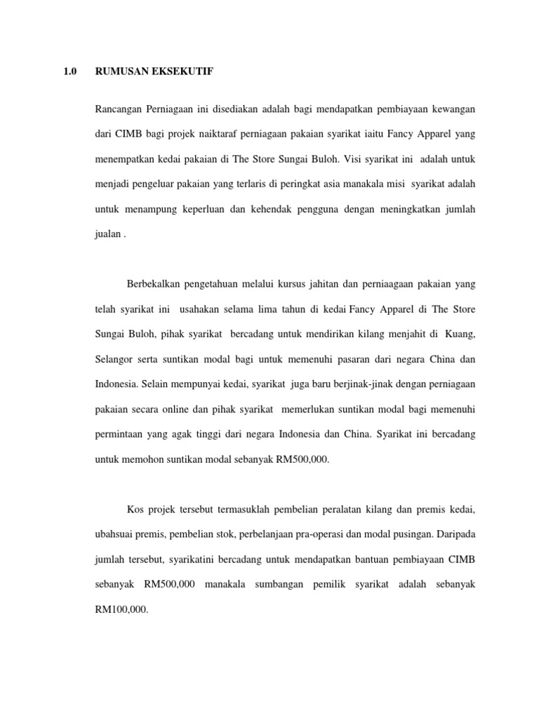 Rancangan perniagaan ini disediakan adalah bagi mendapatkan pembiayaan kewangan dari cimb bagi projek naiktaraf perniagaan pakaian saya iaitu fancy apparel yang menempatkan kedai pakaian di the store sungai buloh. Tingkatan 4 scribd read books. Read this essay on rancangan perniagaan. 6 manfaat menggunakan busana dan baju muslim. Tujuan rancangan perniagaan/ kertas kerja.
